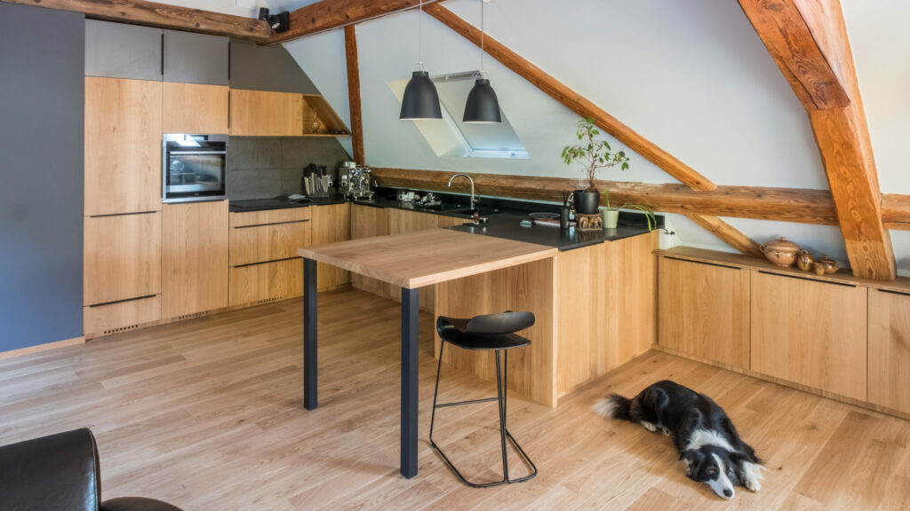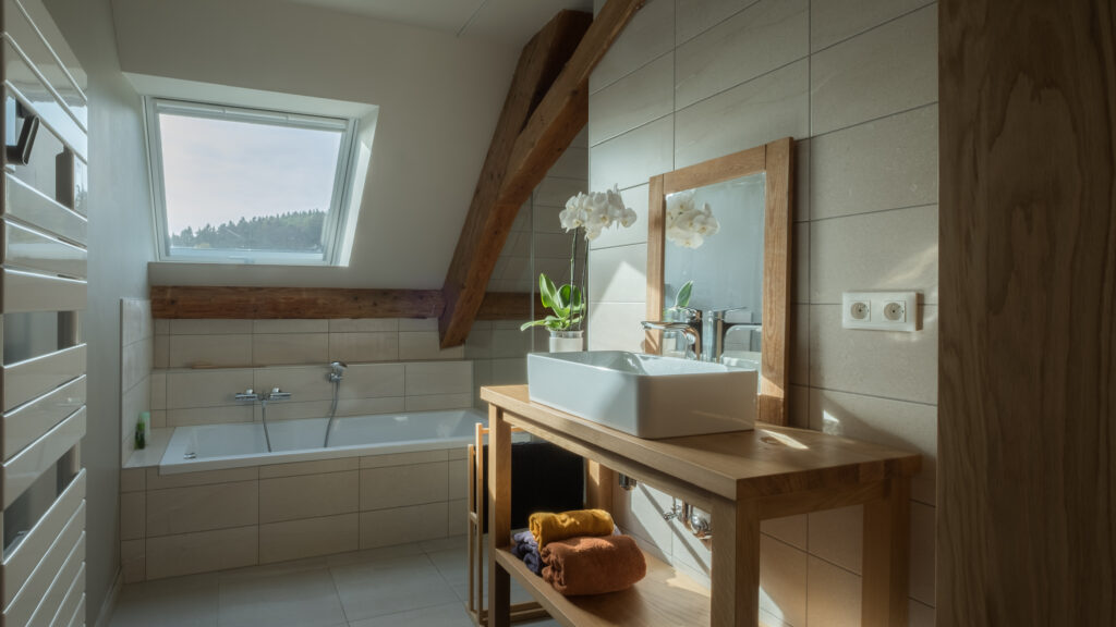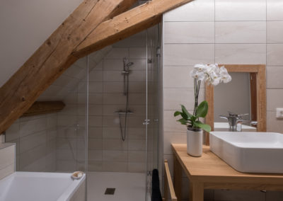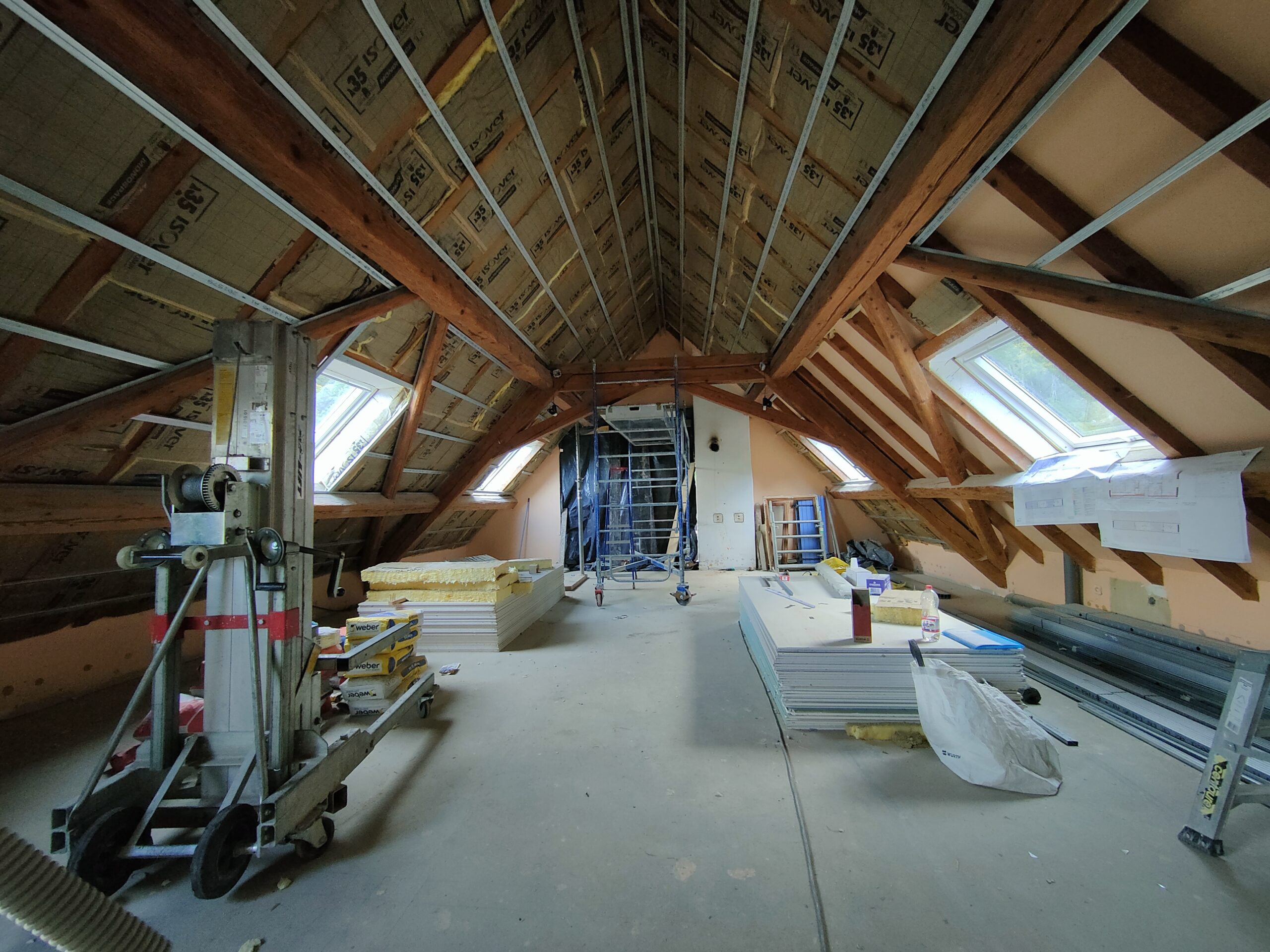 Reconstruction complète des combles d’une ancienne ferme. Cet espace inutilisé a été transformé en un espace de vie chaleureux et lumineux pour y installer une résidence principale. L’optimisation des volumes sous pente et le choix de matériaux sobres apportent confort et caractère à ce nouvel espace.