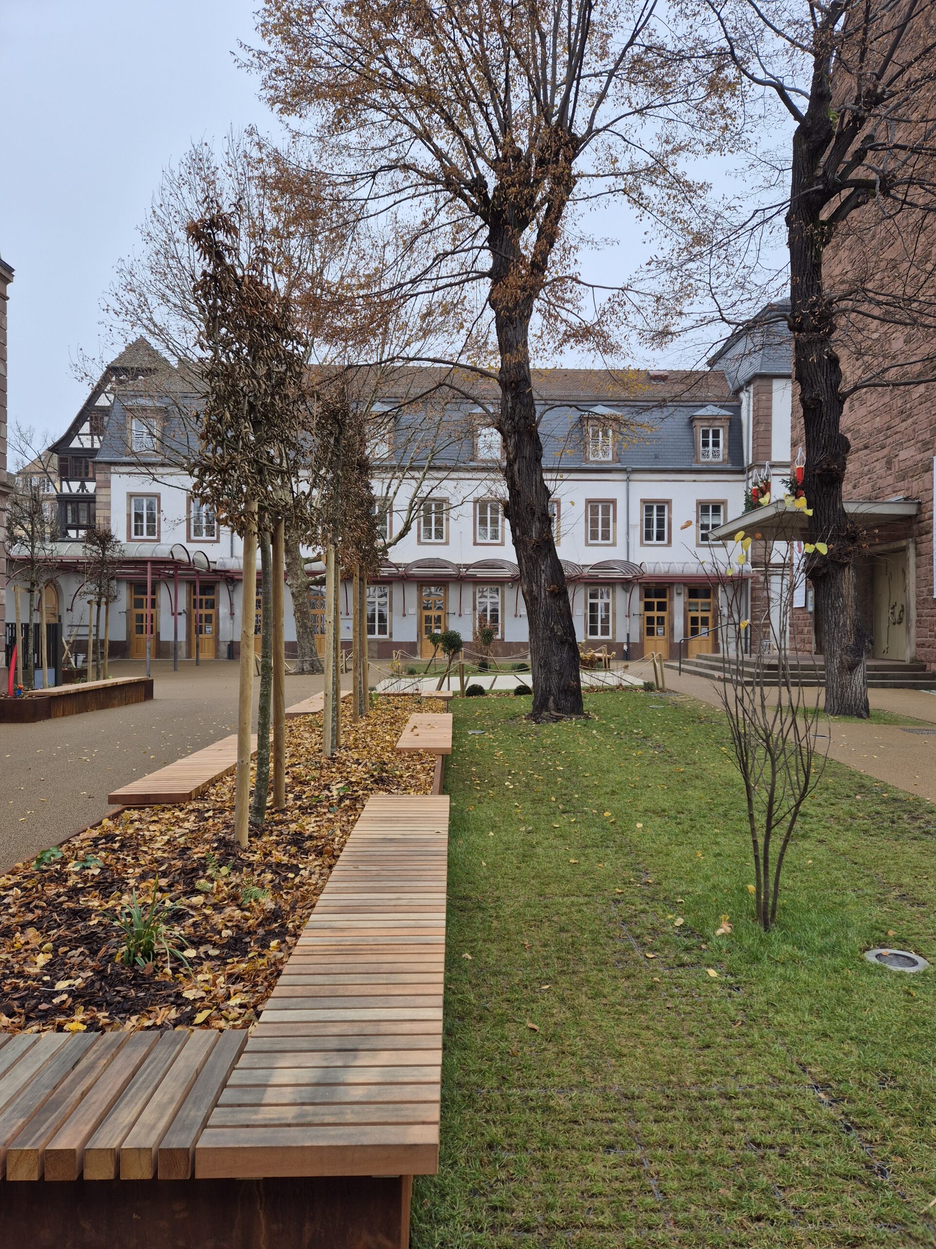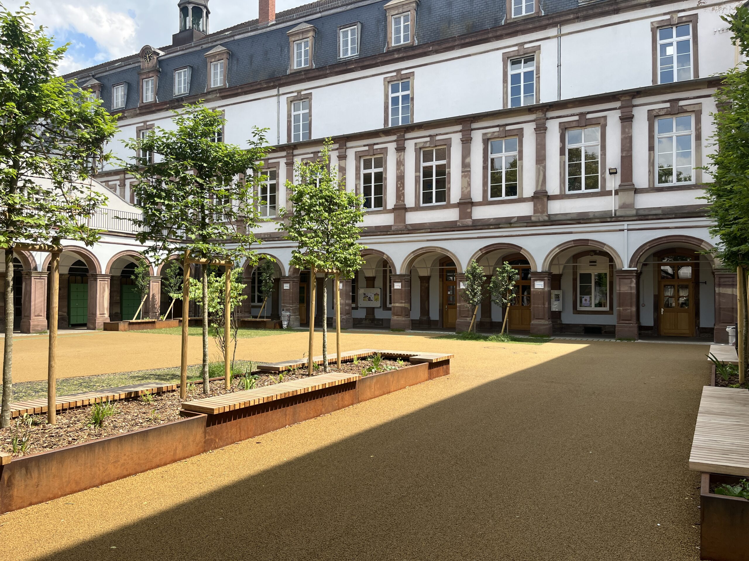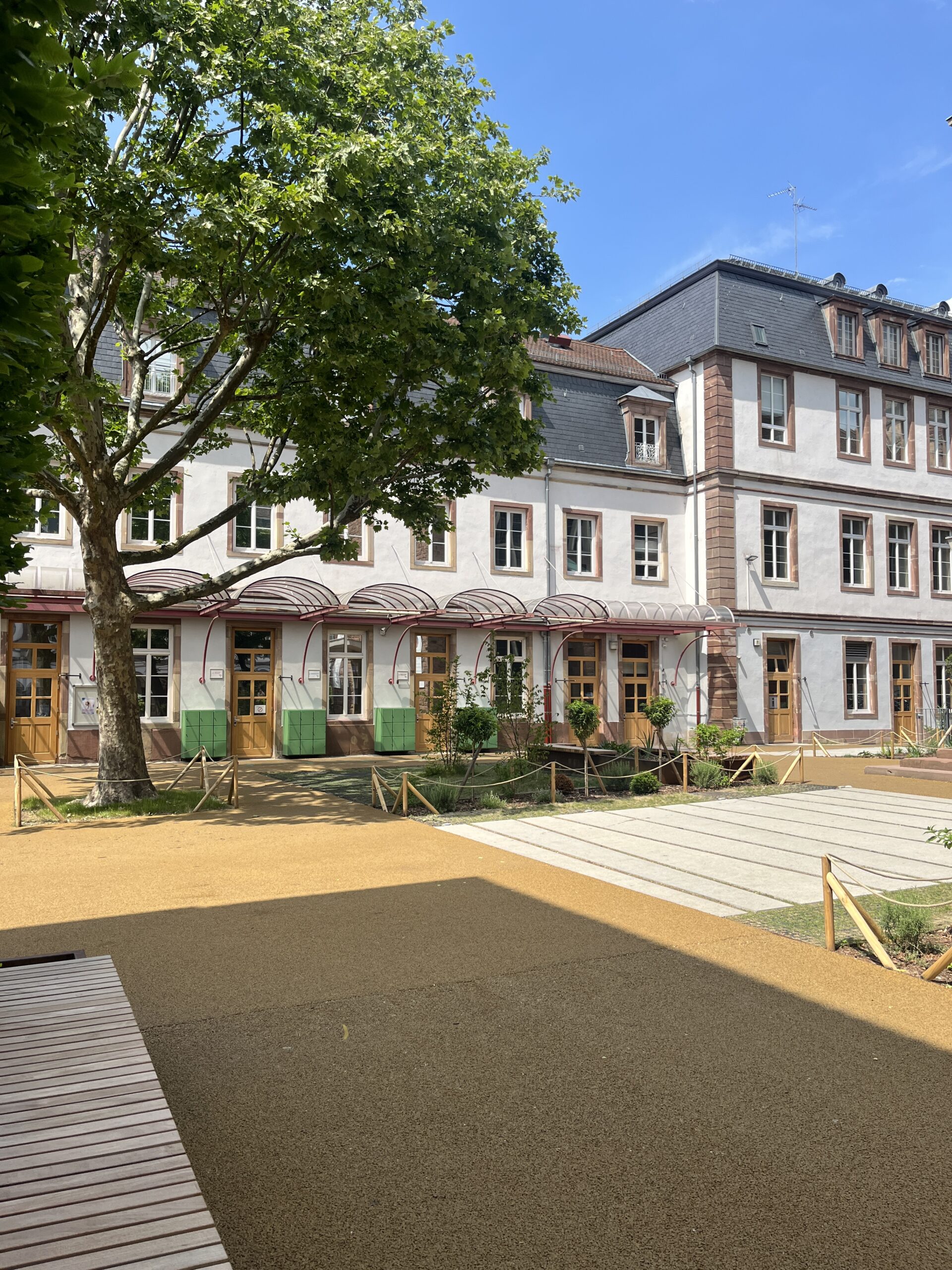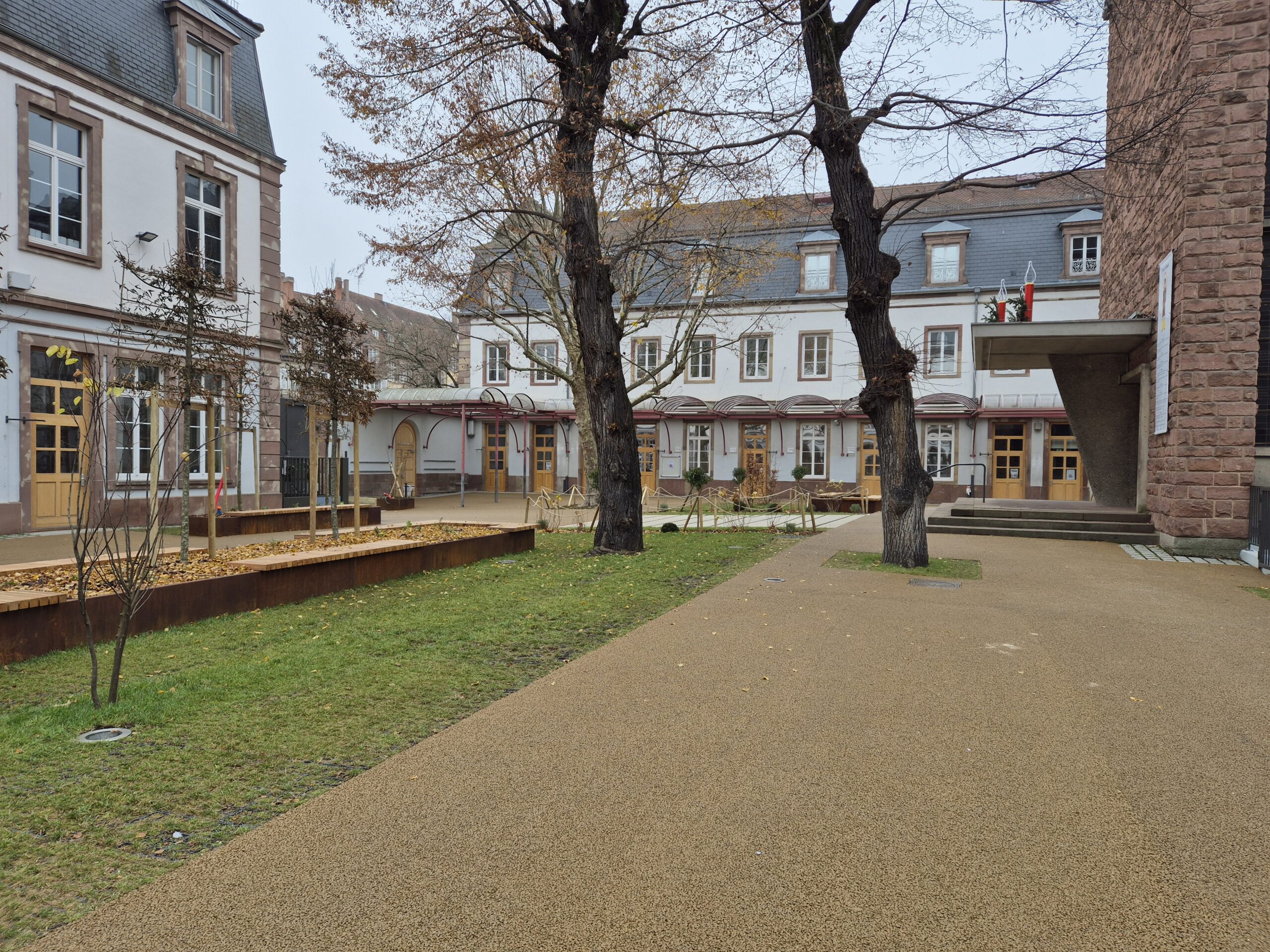 La cour a été repensée autour d’un apport important de végétation, tout en conservant les arbres remarquables existants. L’aménagement privilégie l’ombre, le confort et la biodiversité, avec des essences adaptées aux conditions urbaines.