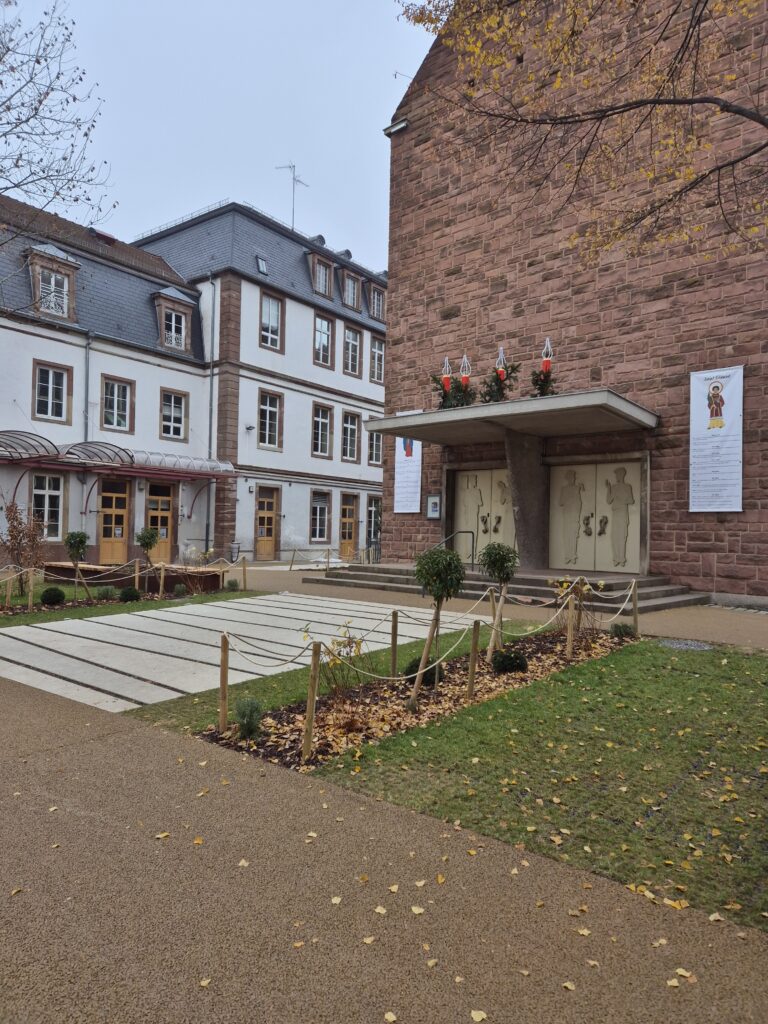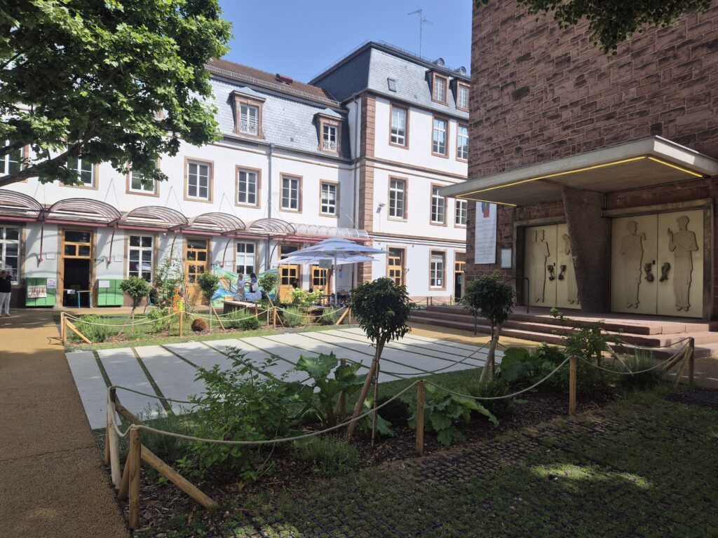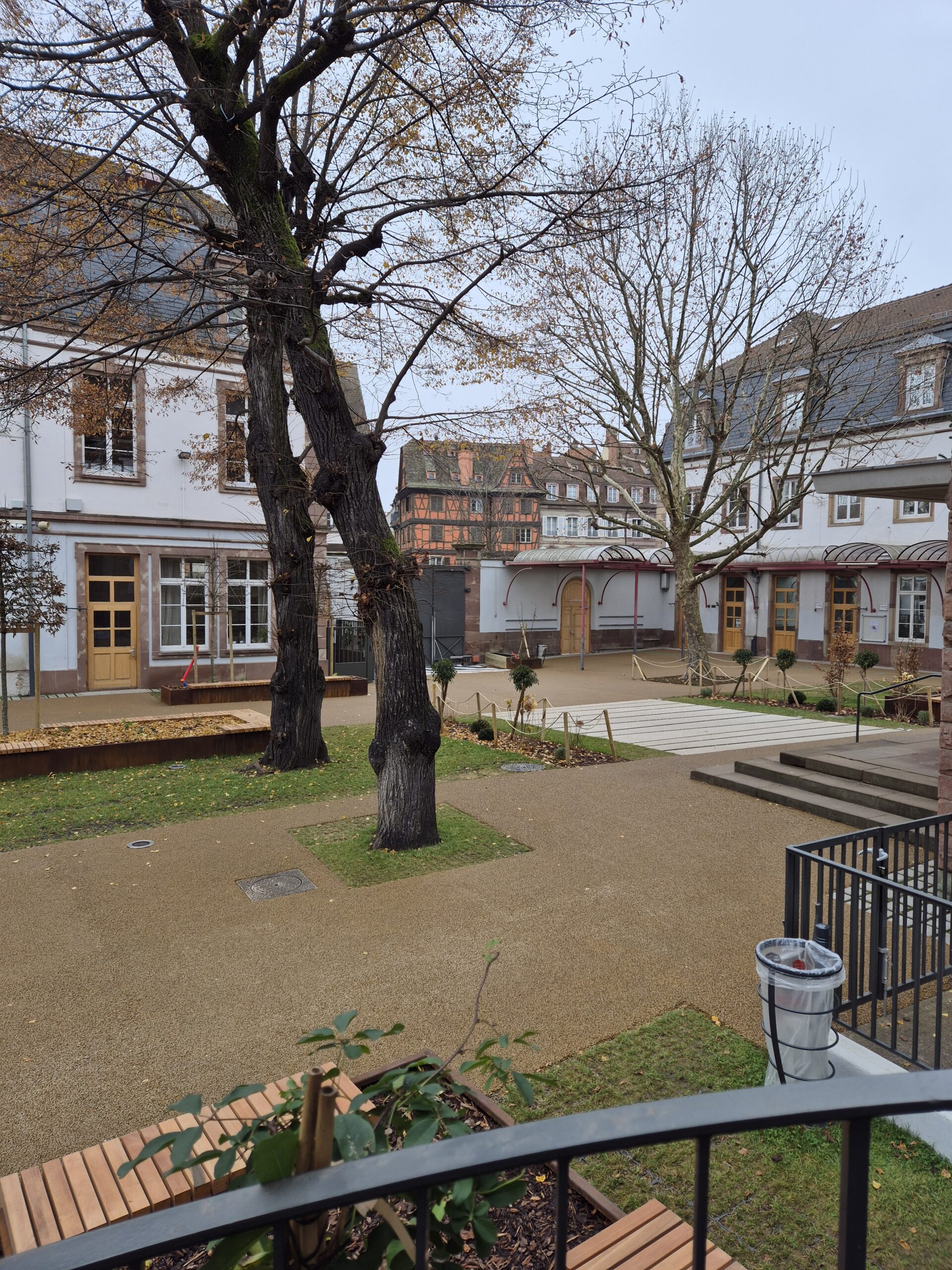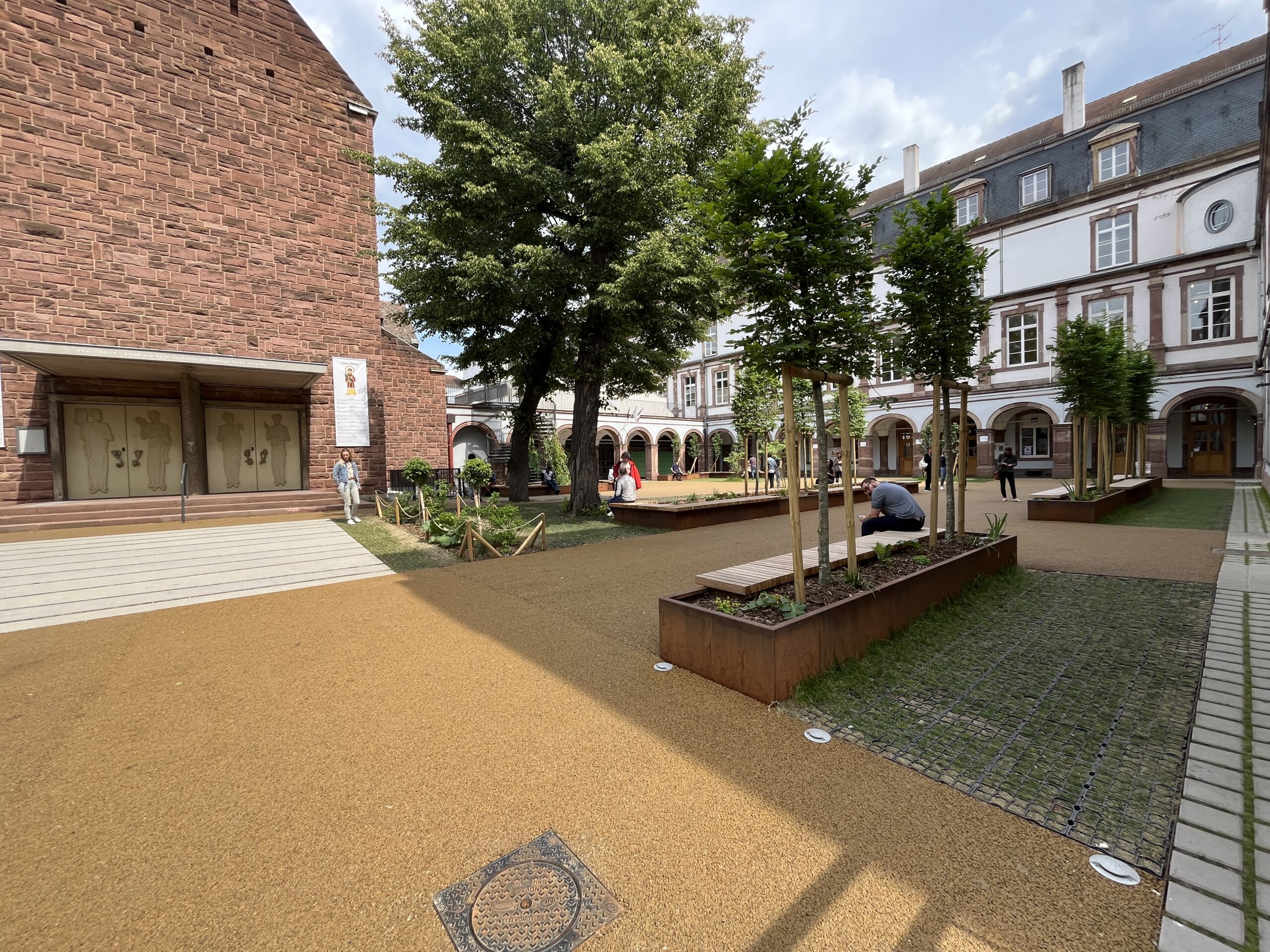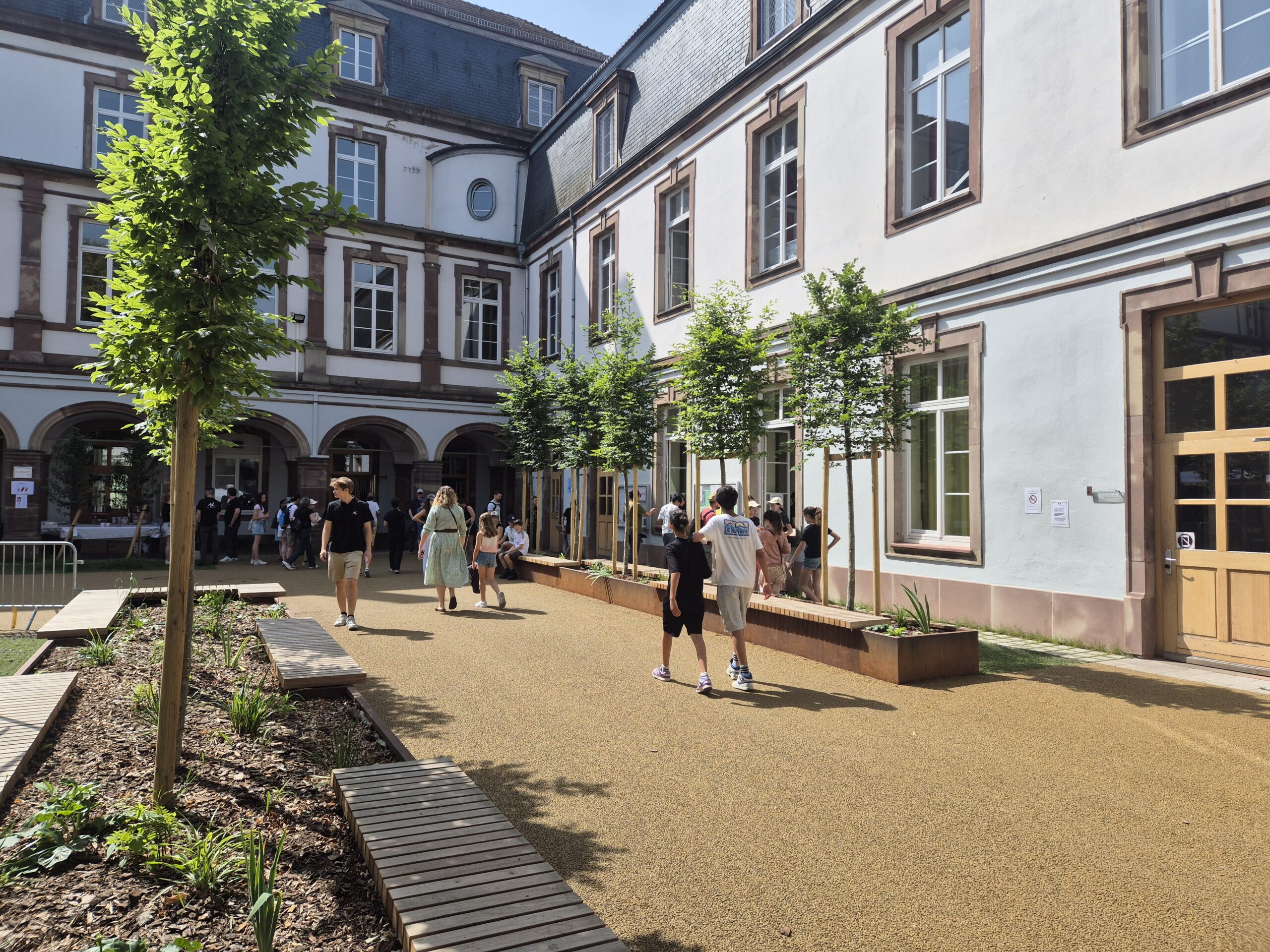 La cour a été repensée autour d’un apport important de végétation, tout en conservant les arbres remarquables existants. L’aménagement privilégie l’ombre, le confort et la biodiversité, avec des essences adaptées aux conditions urbaines.