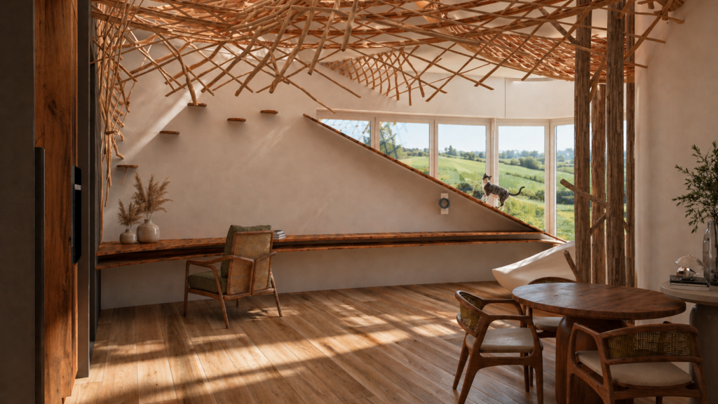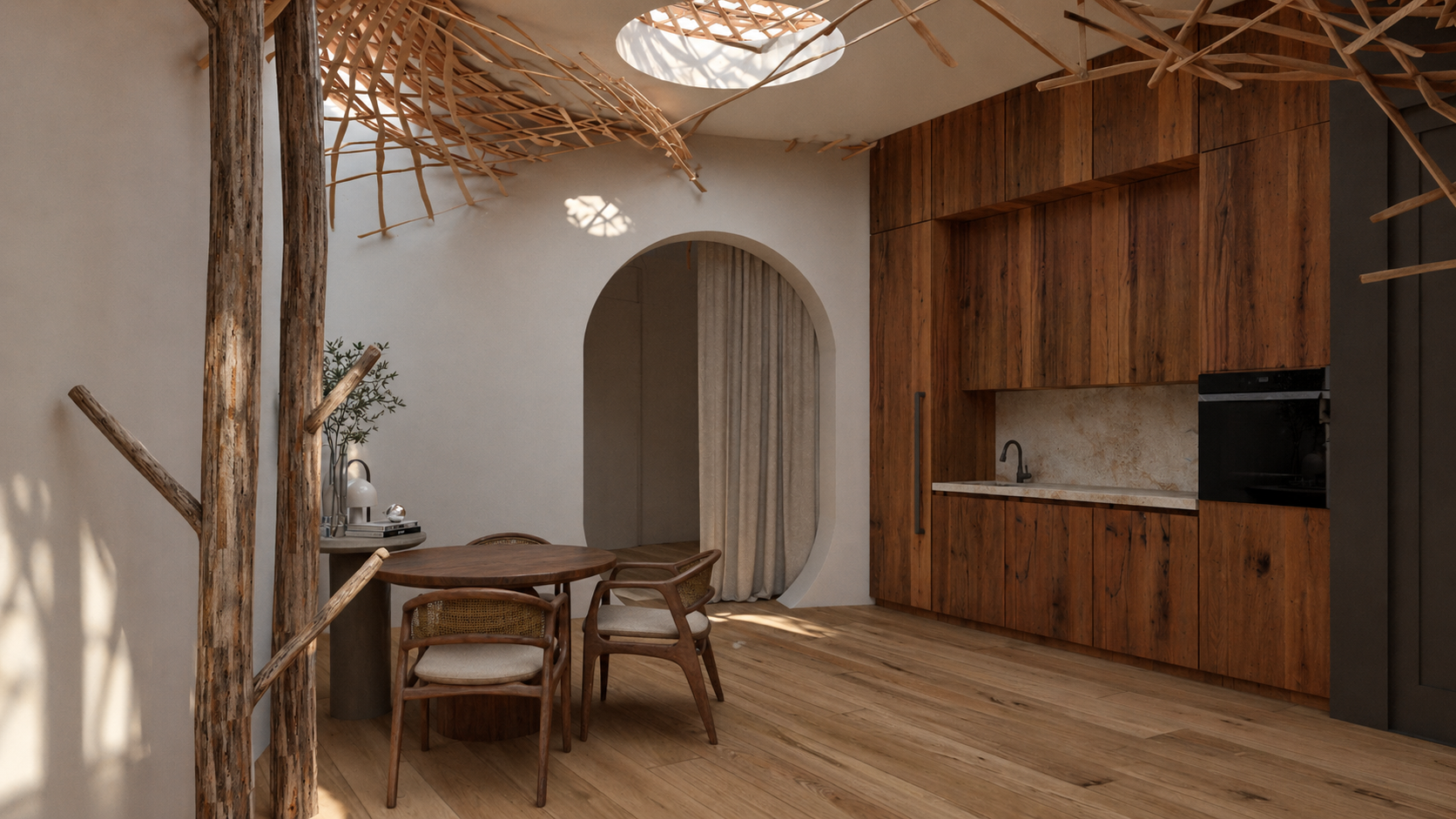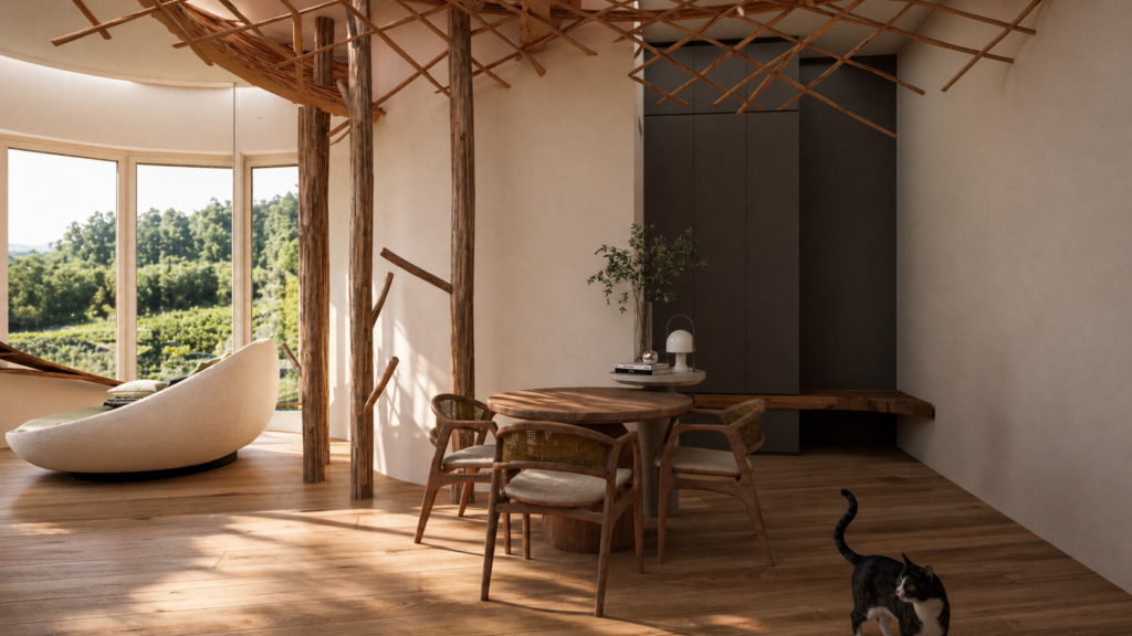 Créer un espace multifonction permettant un atelier de peinture, l’accueil d’amis; un cocon architectural ouvert sur l’extérieur, avec un intérieur mêlant forme organique et nature pénétrante.