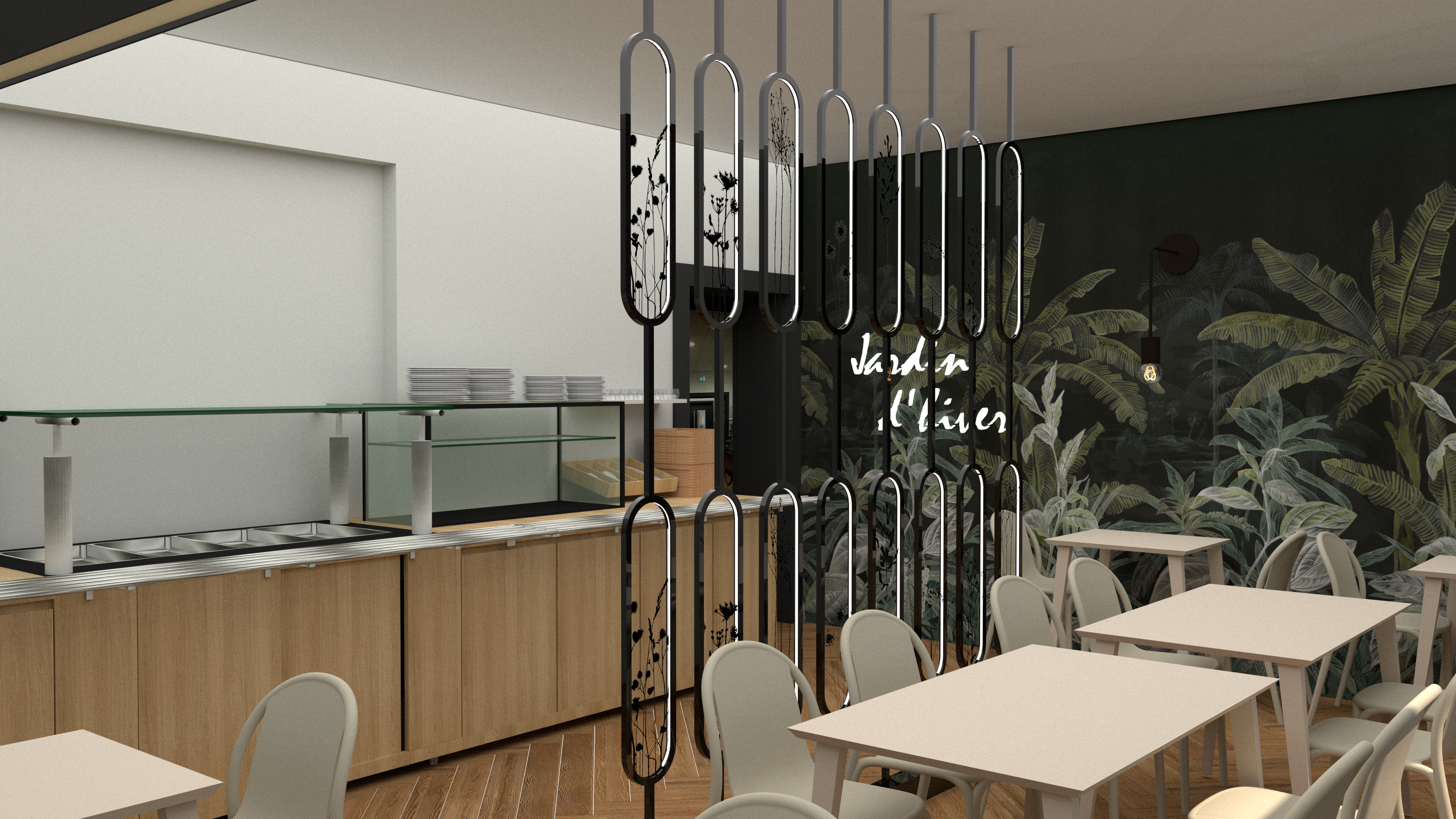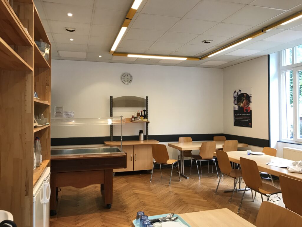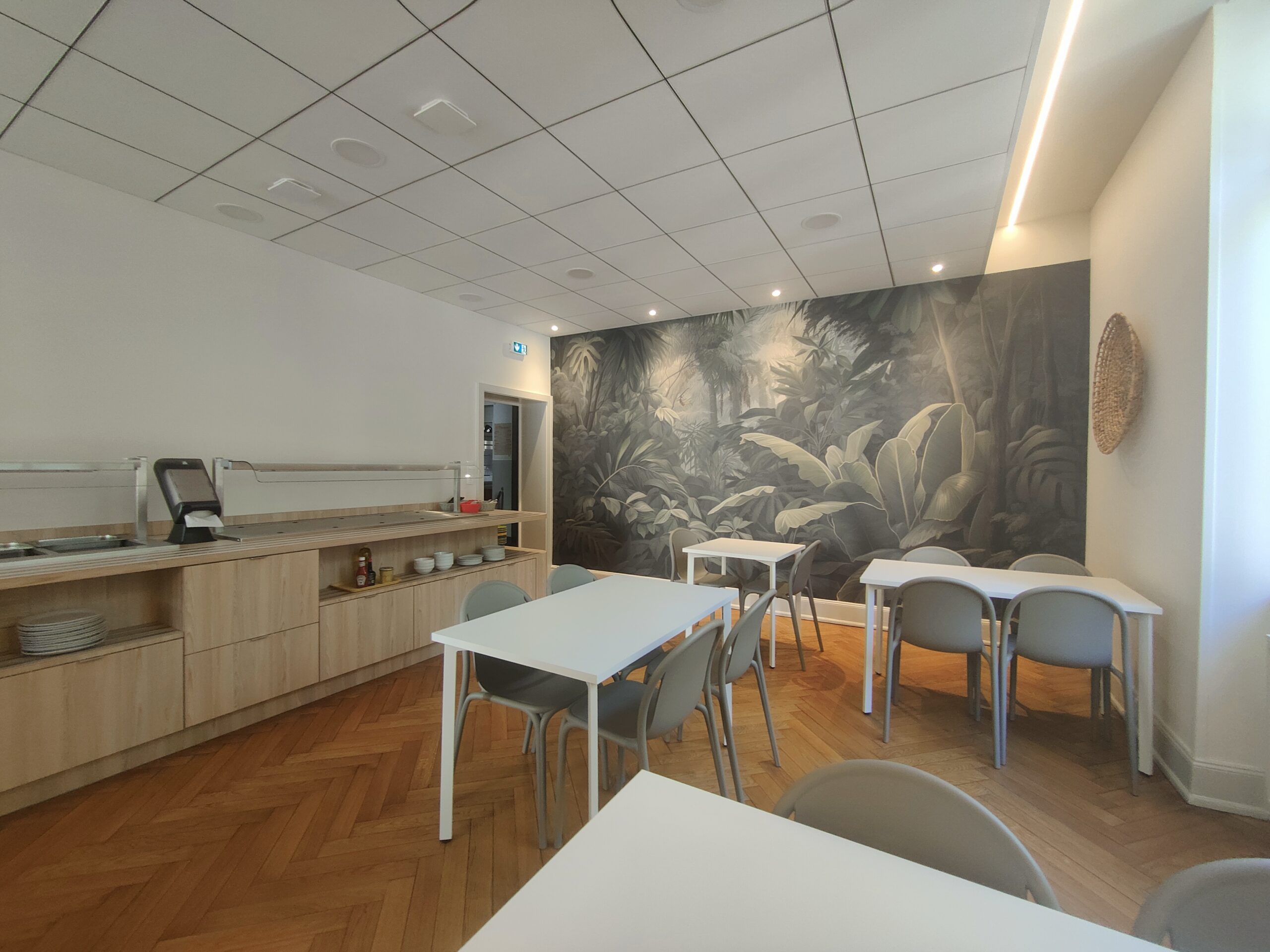 Réaménagement de cette salle de 32m² pour offrir au personnel un cadre unique, de déconnexion au moment de la pause déjeuner. L’enjeu : dans un espace restreint mise en place de cet espace de convivialité avec sa ligne de distribution pour un déjeuner en parfaite autonomie, le tout dans le calme et un climat serein, propice pour valoriser sa pause déjeuner