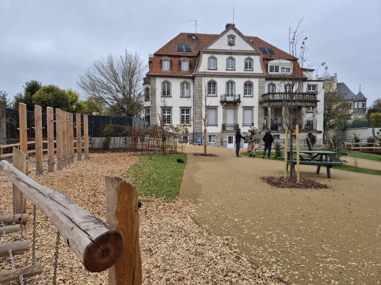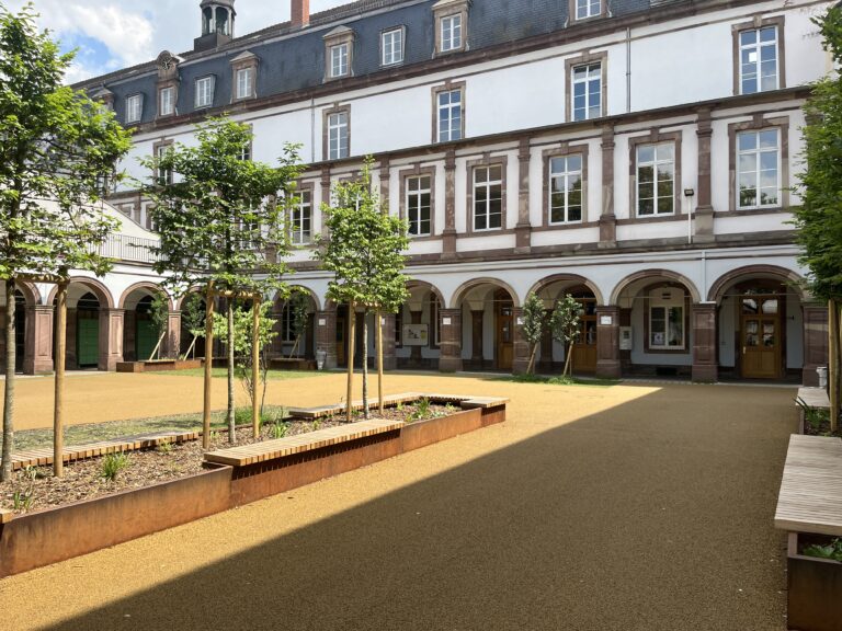 Collège/Lycée Episcopal Saint-Etienne – Strasbourg La cour a été repensée autour d’un apport important de végétation, tout en conservant les arbres remarquables existants. L’aménagement privilégie